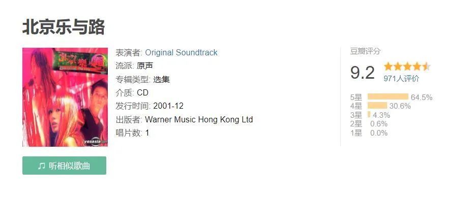 早在千禧年初,搖滾電影《北京樂與路》上映,這部電影在豆瓣上的評分為7.2,好于80%的音樂片。而在電影原聲音樂的表現(xiàn)力,這部電影顯然優(yōu)秀得多。電影選擇子曰樂隊來獨挑大梁,除了子曰樂隊的《磁器》、《光的深處》等貼合主角形象的搖滾樂作品,電影也做了許多貼合劇情的優(yōu)秀原聲配樂,諸如《回憶之前,忘記之后》、《北京樂與路》等,大膽地運用了二胡等民樂。最終,這張原聲專輯在豆瓣上獲得了9.2的評分。
