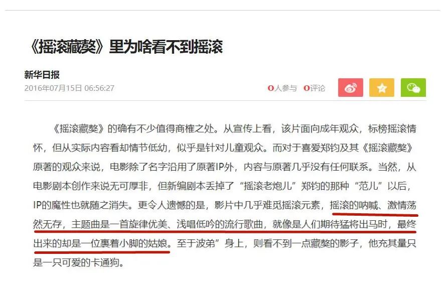 例如,鄭鈞的搖滾題材動畫《搖滾藏獒》、大鵬的《縫紉機樂隊》,音樂本身的表現(xiàn)力不夠成為觀眾給出差評的主要原因。就像當年新華日報給《搖滾藏獒》的評價,“搖滾的吶喊、激情蕩然無存,主題曲是一首流行歌曲,就像期待猛將出馬,最終出來的確實一個裹著小腳的姑娘?!倍犊p紉機樂隊》無論是各類樂手的客串參演,還是片末合奏的《不再猶豫》,都是在用情懷來填補音樂上的不足。
