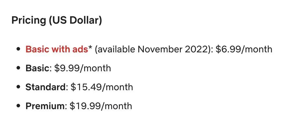 用戶增長停滯、用戶對會員費的承受能力又有限,“收入=用戶數(shù)x會員費”這一商業(yè)模式逐漸顯示出局限性,Netflix想要跨地區(qū)、跨文化擴張,保持強勁增長,低價格、含廣告的訂閱模式成為了新的選擇。10月14日,Netflix宣布將于下個月在澳大利亞、巴西、加拿大等12個國家上線含廣告套餐“Basic with ads”。