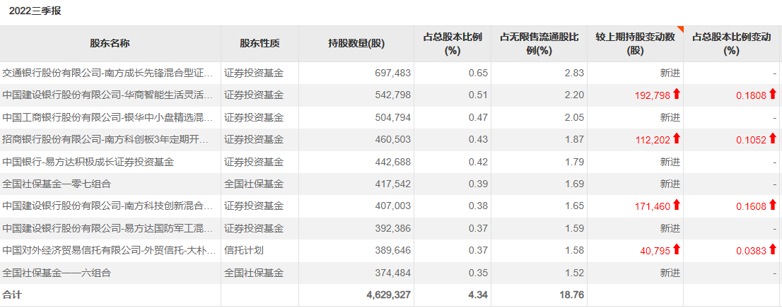 其中,何崇愷管理的易方達(dá)國(guó)防軍工混合型證券投資基金、易方達(dá)積極成長(zhǎng)證券投資基金兩只基金合計(jì)持有公司0.79%的股份;全國(guó)社?;鹨涣闫呓M合、全國(guó)社保基金一一六組合均在列。