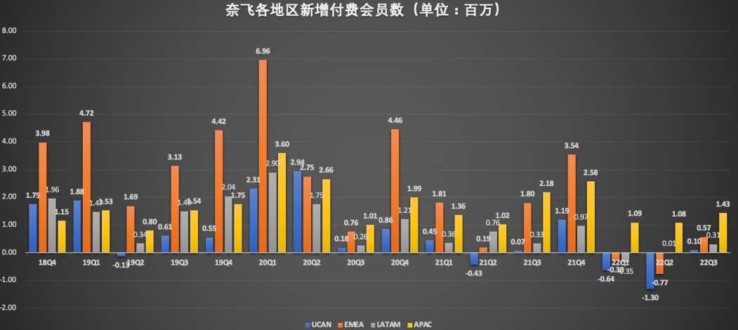 2022年Q3,奈飛UCAN市場實現(xiàn)營收為36.02億元,同比增長11%,為該公司貢獻了45.4%的營收。三季度,UCAN地區(qū)的訂閱用戶凈增長10萬至7339萬;