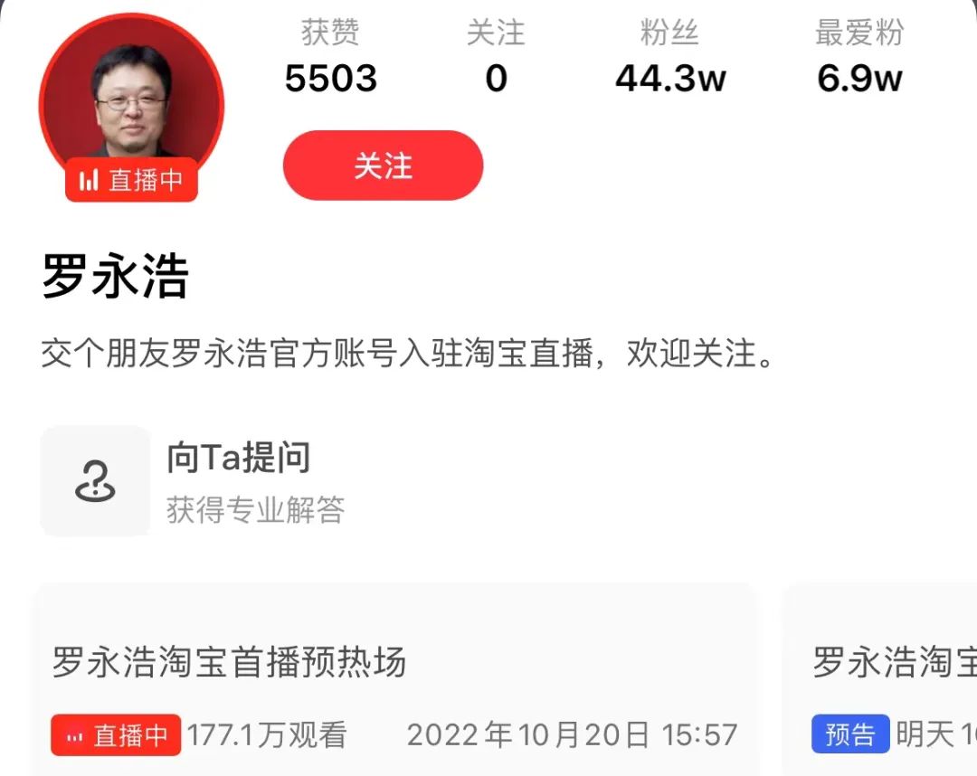 觀潮新消費(fèi)(ID:TideSight)了解到,在淘寶直播平臺(tái),“羅永浩”和“交個(gè)朋友嚴(yán)選店”都已經(jīng)開通了賬號(hào)。其中“交個(gè)朋友嚴(yán)選店”主播粉絲1.2萬,而羅永浩個(gè)人淘寶直播賬號(hào)已有44.3萬粉絲,今天已開始首播預(yù)熱場(chǎng)。