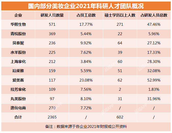 而在研發(fā)團(tuán)隊(duì)建設(shè)上,國貨頭部企業(yè)也正迎頭趕上。據(jù)化妝品觀察此前統(tǒng)計,2021年,10家美妝相關(guān)上市公司的研發(fā)總?cè)藬?shù)達(dá)到2365人,其中,華熙生物、貝泰妮和丸美股份的研發(fā)人員數(shù)量分別已占到公司總?cè)藬?shù)的17.77%、9.92%和8.10%(詳見《1954項(xiàng)專利背后的“研發(fā)爭霸”》)。