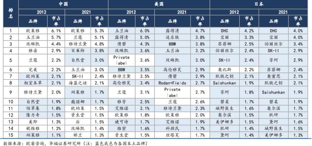 據(jù)歐睿咨詢披露的數(shù)據(jù),2021年美國市場TOP15護(hù)膚品中,本土品牌占11席;日本TOP15護(hù)膚品,更全部被本土品牌包攬。反觀中國市場,TOP3仍由歐美品牌占領(lǐng),TOP15品牌中,也僅有百雀羚、自然堂、珀萊雅、薇諾娜4個本土品牌,這一競爭格局,相比2012年幾乎沒有大的變化。