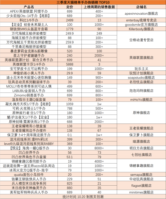 國產(chǎn)游戲IP方面,除了《原神》《保衛(wèi)蘿卜》,《崩壞3》《王者榮耀》《明日方舟》《少女前線》等IP手辦,也都進(jìn)入在三季度內(nèi)進(jìn)入過天貓手辦熱銷榜TOP10。