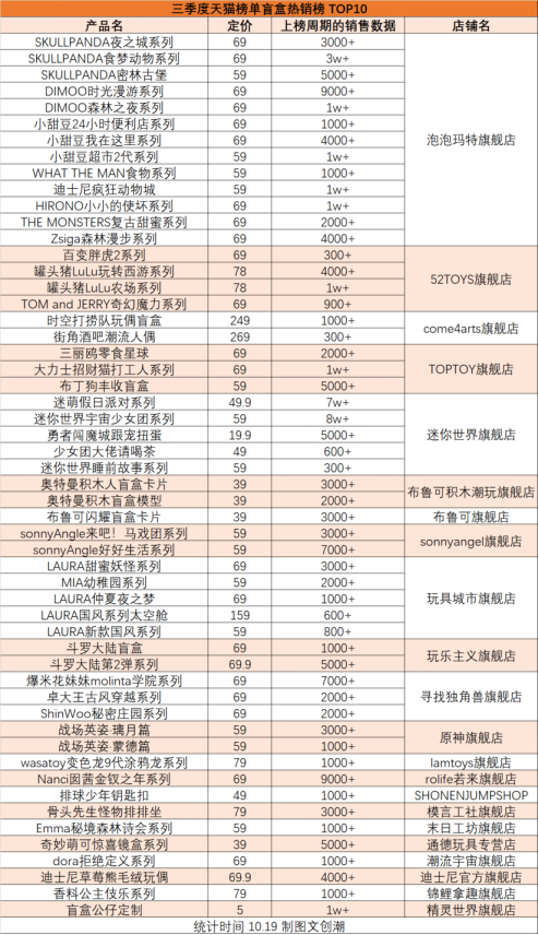 其中SKULLPANDA食夢動(dòng)物系列,在8月中旬月銷突破3萬。SKULLPANDA作為泡泡瑪特的熱門IP,除了食夢動(dòng)物系列,夜之城系列、密林古堡系列也都在三季度登上過天貓盲盒熱銷榜。