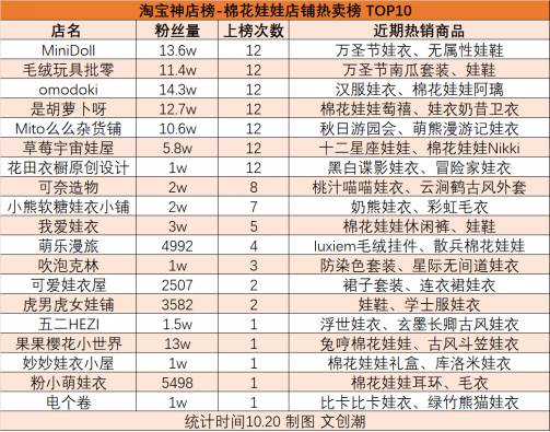 第三季度,曾有19家店鋪進(jìn)入淘寶棉花娃娃店鋪熱賣榜。其中MiniDoll、毛絨玩具批零、omodoki、是胡蘿卜呀、Mito么么雜貨鋪、草莓宇宙娃屋、花田衣櫥原創(chuàng)設(shè)計(jì)這7家店鋪連續(xù)12期進(jìn)入榜單。
