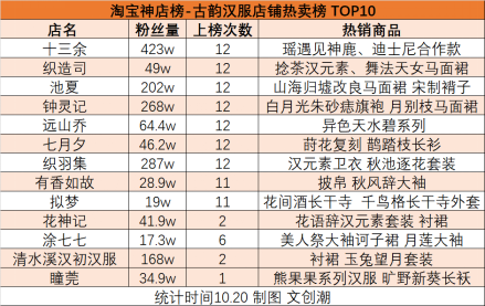 三季度,有13家店鋪進(jìn)入淘寶古韻漢服店鋪榜,分別是十三余小豆蔻兒國風(fēng)工作室、織造司、池夏、鐘靈記、遠(yuǎn)山喬、七月夕、織羽集、有香如故、擬夢、花神記、涂七七、清水溪漢初漢服、瞳莞漢服工作室。