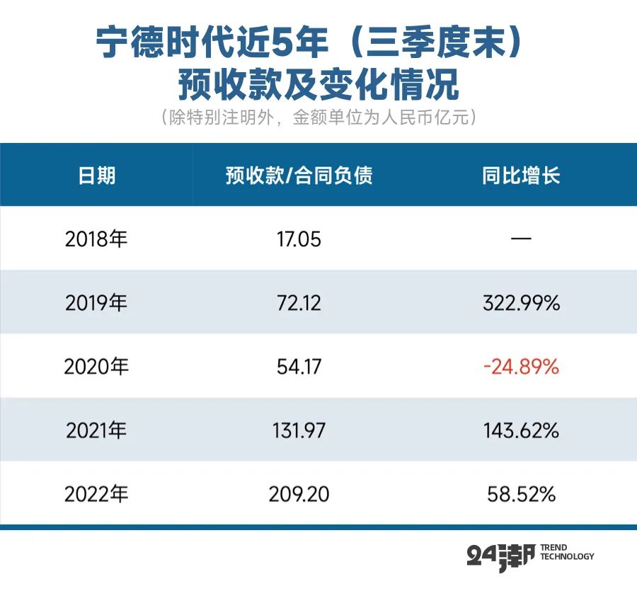 很多數(shù)據(jù)及信息顯示,未來(lái)寧德時(shí)代仍有很強(qiáng)的增長(zhǎng)潛力。比如據(jù)24潮統(tǒng)計(jì),截止9月末寧德時(shí)代 “合同負(fù)債”(對(duì)應(yīng)客戶預(yù)收款)達(dá)歷史新高的209.20億元,同比增長(zhǎng)了58.52%。