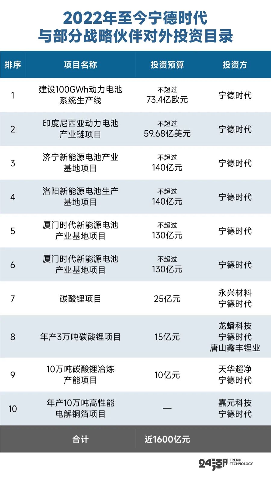 第三維度,在產(chǎn)業(yè)布局上仍展現(xiàn)了兇猛的進(jìn)擊勢(shì)頭,據(jù)24潮統(tǒng)計(jì),2022年至今寧德時(shí)代及其戰(zhàn)略盟友至少對(duì)外公布了10個(gè)重大投資項(xiàng)目,總投資額近1600億元。
