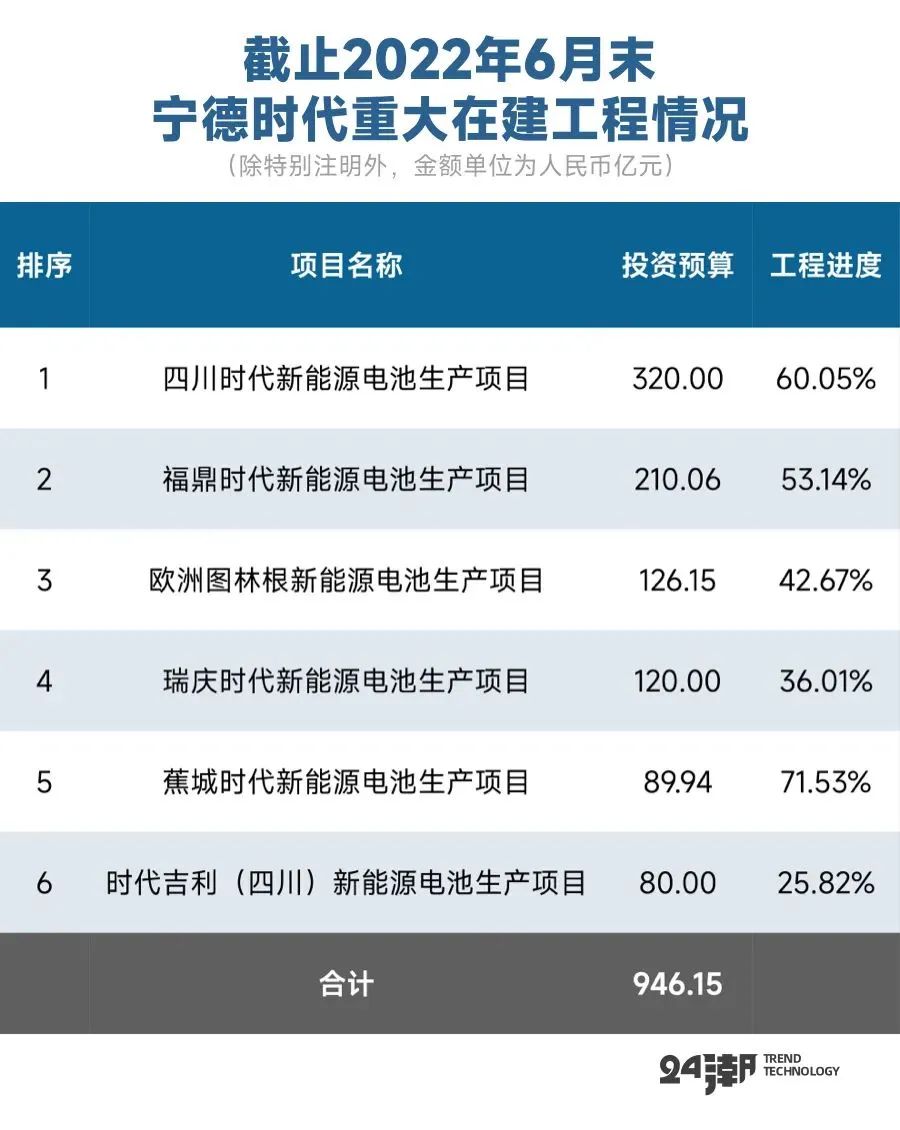 目前,寧德時(shí)代至少6個(gè)重大工程進(jìn)入執(zhí)行、施工階段,僅這6大在建工程總投資預(yù)算合計(jì)約為946.15億元。