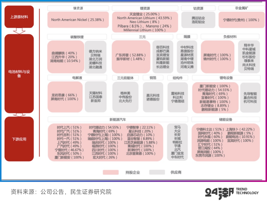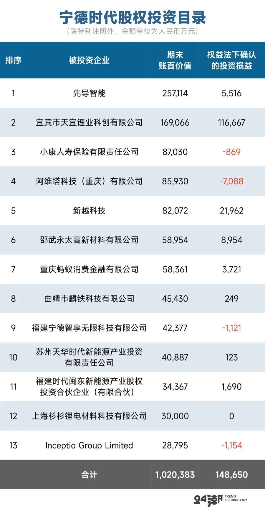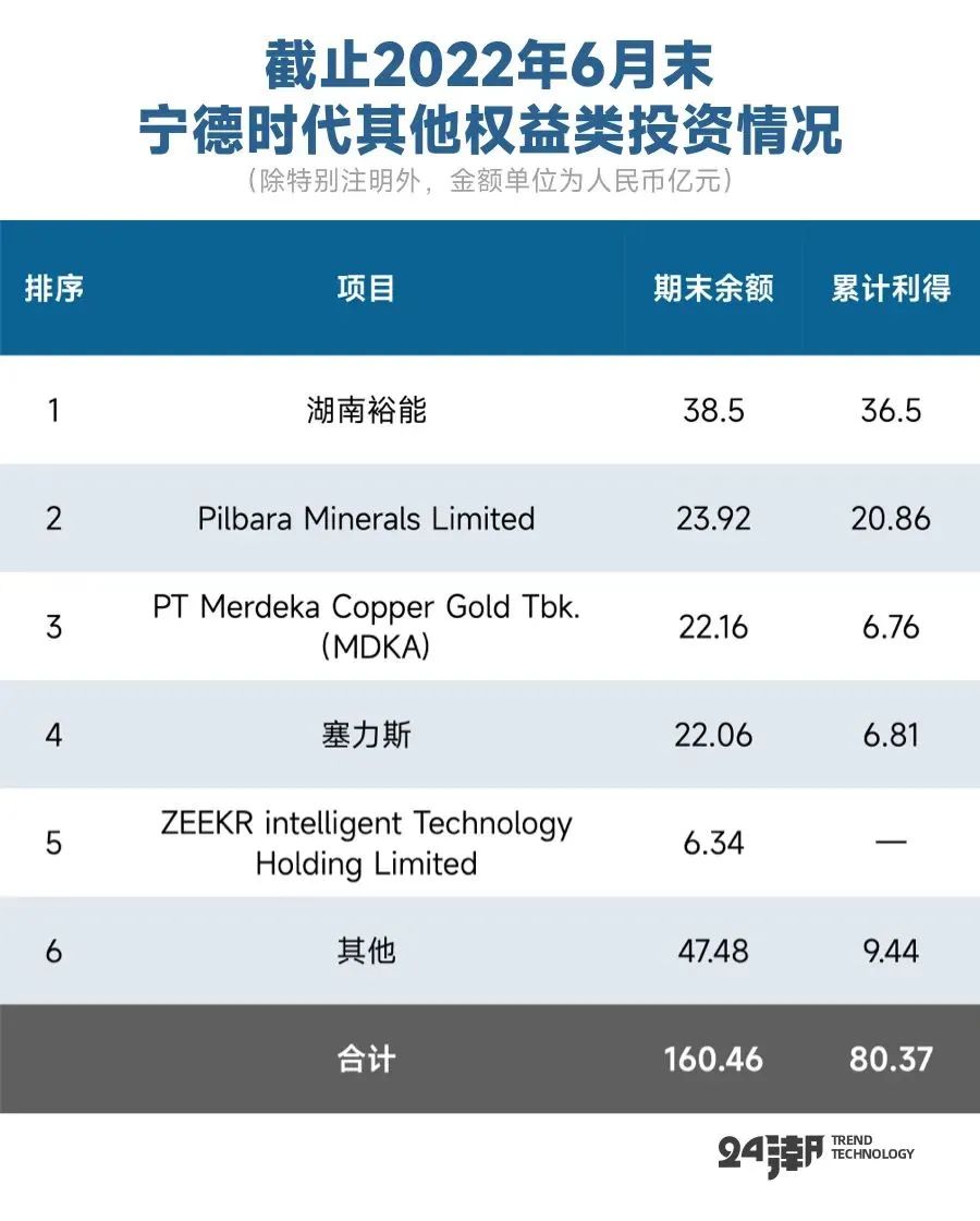另?yè)?jù)24潮團(tuán)隊(duì)統(tǒng)計(jì),截止2022年6月末,寧德時(shí)代長(zhǎng)期股權(quán)投資金額為141.88億元,其他權(quán)益類投資金額為160.46億元,兩者合計(jì)為302.34億元。其主要聯(lián)營(yíng)企業(yè)還包括天宜鋰業(yè)(天華超凈子公司)、曲靖麟鐵(德方納米子公司)、江西升華(富臨精工子公司)、常州鋰源(龍?bào)纯萍甲庸荆┑?,合作伙伴均為上市公司,且均占?jù)細(xì)分領(lǐng)域頭部位置。