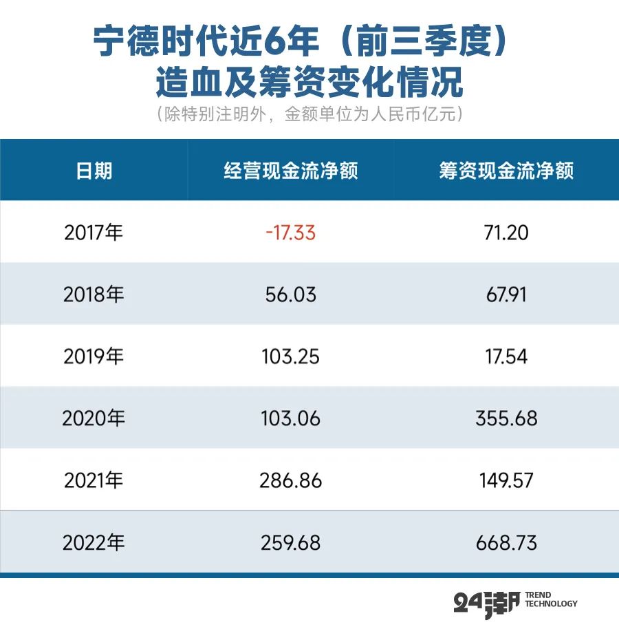 第五維度,強(qiáng)悍的造血力與資本號(hào)召力,一直是寧德時(shí)代持續(xù)兇猛擴(kuò)張的核心支撐之一。據(jù)24潮統(tǒng)計(jì),2022年前三季度寧德時(shí)代 “經(jīng)營(yíng)活動(dòng)產(chǎn)生的現(xiàn)金流量?jī)纛~” 和 “籌資活動(dòng)現(xiàn)金流凈額” 分別為259.68億元和436.43億元,僅這兩項(xiàng)就合計(jì)為寧德時(shí)代提供了928.41億元的凈現(xiàn)金流,同比增長(zhǎng)112.73%。