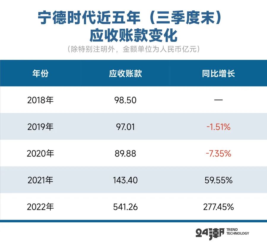 如下表所示,截止2022年9月末寧德時(shí)代應(yīng)收賬款規(guī)模達(dá)歷史新高的541.26億元,同比增長(zhǎng)277.45%,而這遠(yuǎn)超同期營(yíng)收186.72%的增幅。