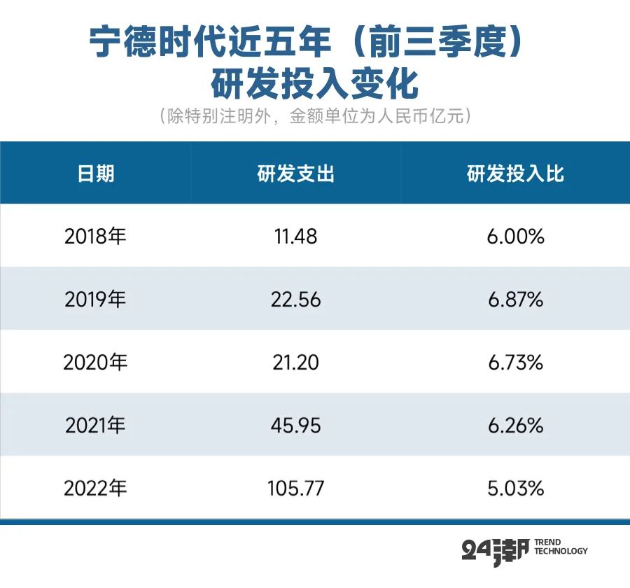 據(jù)24潮統(tǒng)計(jì),寧德時(shí)代研發(fā)投入規(guī)模至少已經(jīng)連續(xù)8年(2015-2022年)保持高速增長(zhǎng)趨勢(shì),2022年前三季度其研發(fā)投入規(guī)模更是首次突破100億大關(guān),達(dá)105.77億元,同比增長(zhǎng)130.18%。