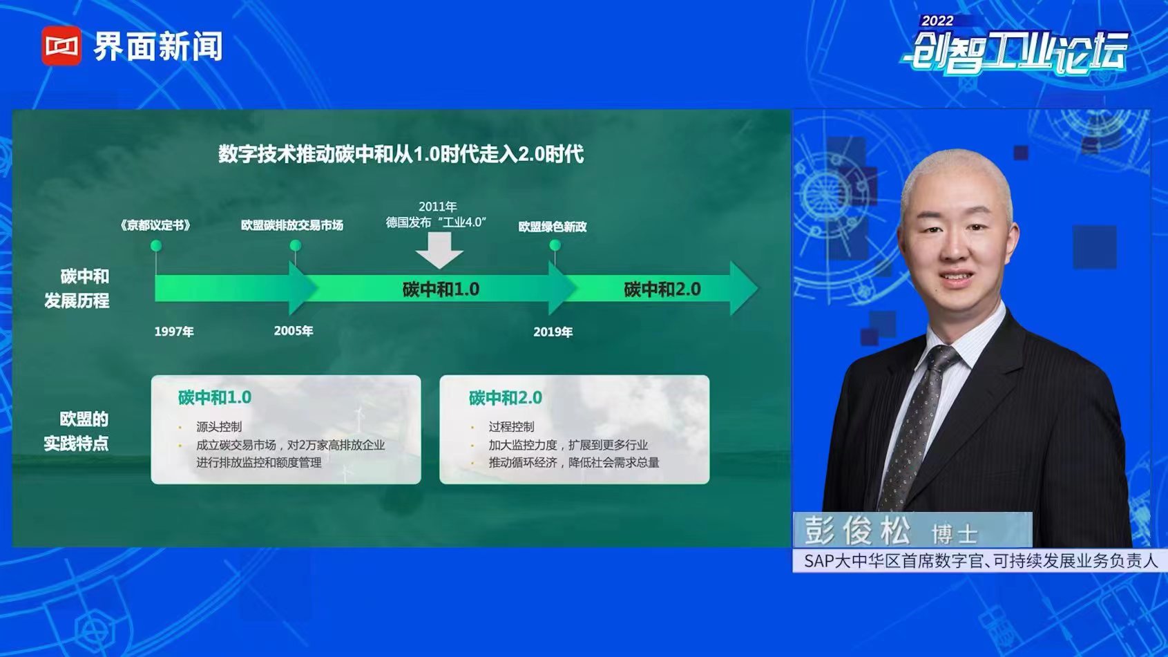 在此背景之下,由上海報業(yè)集團 | 界面新聞主辦的2022第五屆【界面創(chuàng)智工業(yè)論壇】于10月24日舉行了線上云峰會。云峰會現場,SAP大中華區(qū)首席數字官、可持續(xù)發(fā)展業(yè)務負責人彭俊松博士出席發(fā)表了主旨演講《數字化推動下的碳中和2.0》。