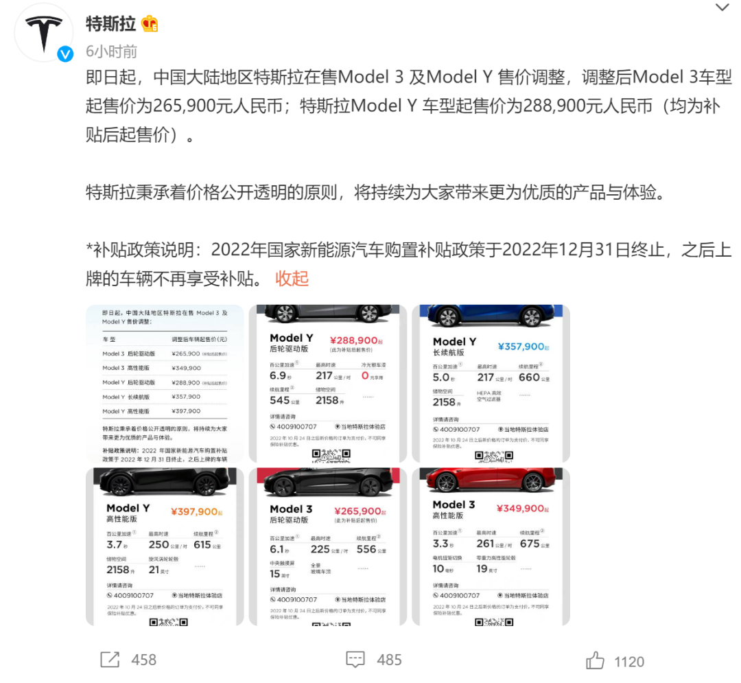10月24日,特斯拉在官方微博宣布,對中國大陸地區(qū)特斯拉Model 3和Model Y兩款車型五個版本起售價進(jìn)行下調(diào),將新能源汽車購置補(bǔ)貼計算在內(nèi)后,兩款車型的起售價分別達(dá)到26.59萬元、28.89萬元,五個版本降幅在1.4-3.7萬元不等。