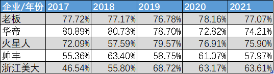 很明顯,高效的管理和規(guī)模效應(yīng)不僅帶來的是人均效應(yīng)的增加,毛利率水平也會有提升:老板電器的毛利率2021年度達(dá)到了52.35%。但同時值得注意的是,老板的凈利率水平卻不是最高的,2021年僅為13.29%,遠(yuǎn)低于火星人和帥豐——也就是說,老板的費(fèi)用率水平,是四者中最高的。