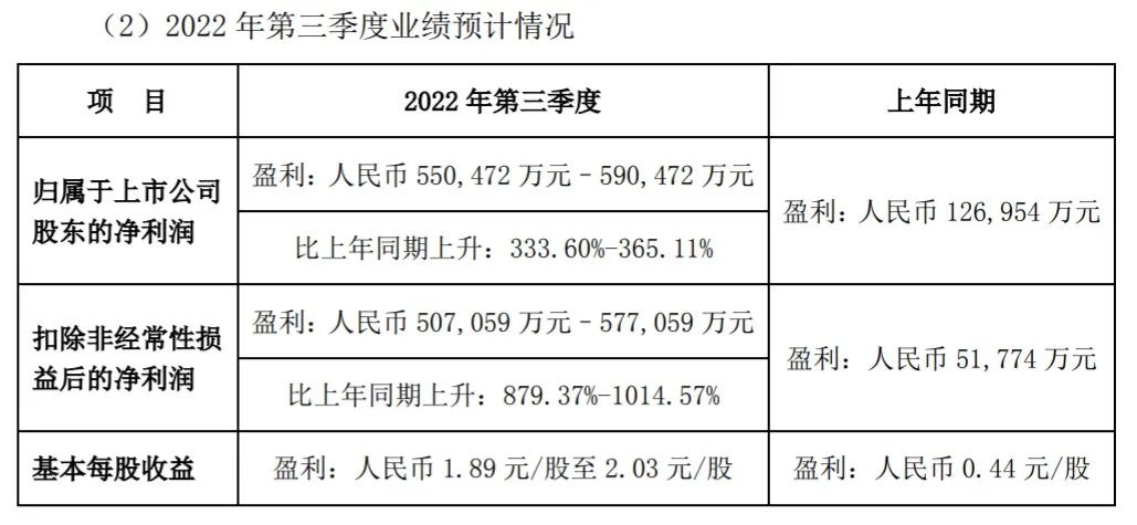 第三季度的表現(xiàn)很是炸裂,預(yù)計歸屬于上市公司股東的凈利潤為55.05億元至59.05億元,占到前三季度總利潤的一半以上,同比預(yù)計實現(xiàn)333.60%至365.11%的增長。