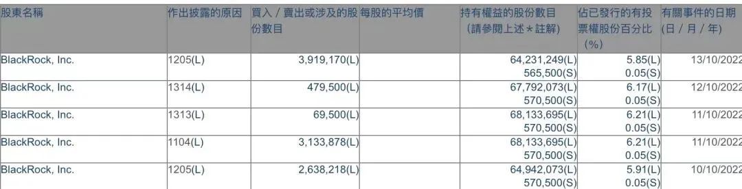 貝萊德增加持記錄,圖片來自港交所