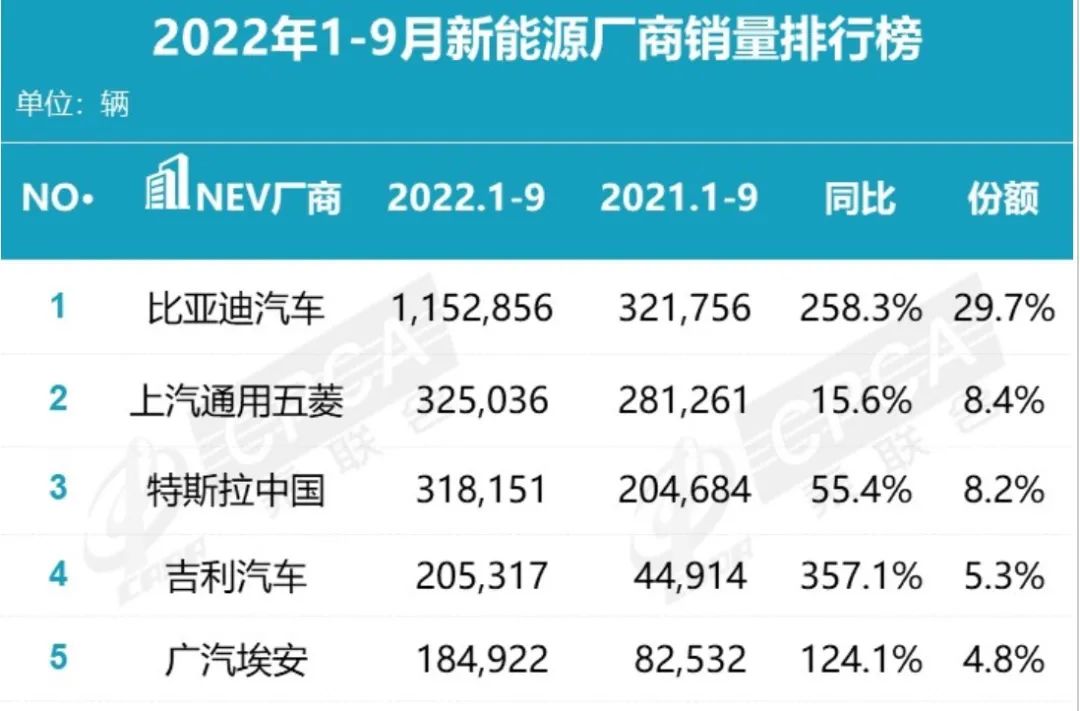 今年1-9月新能源廠商銷量排名榜前五,圖片來自乘聯(lián)會