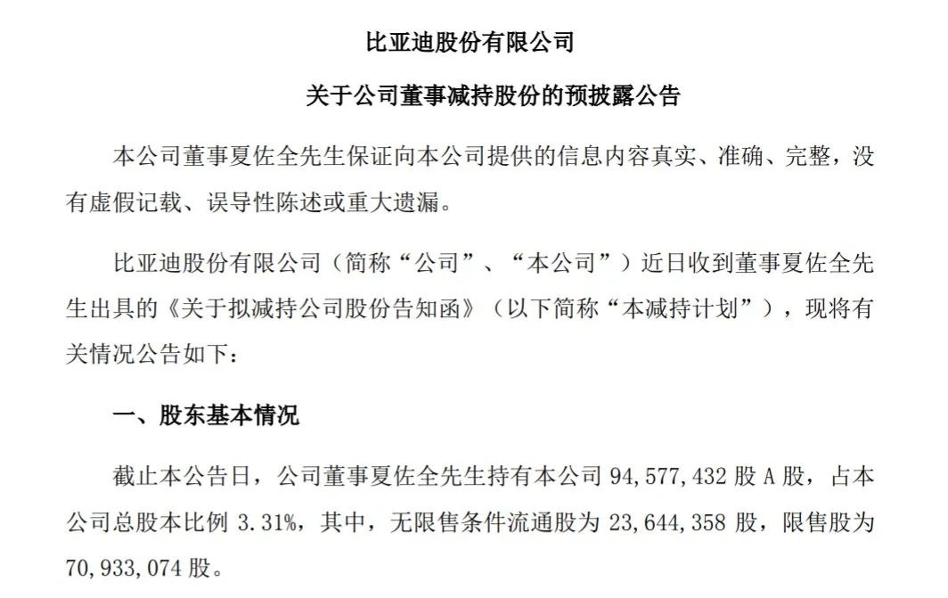 去年董事夏佐全減持預(yù)披露公告,圖片來自比亞迪公告