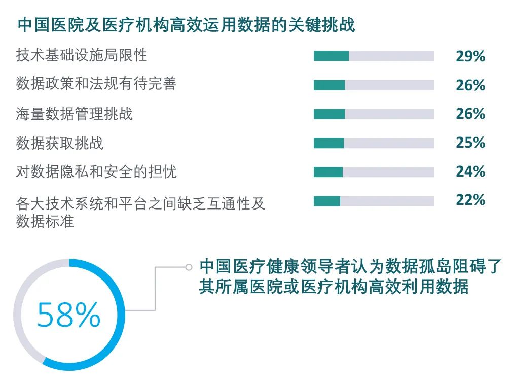超過兩成的中國醫(yī)療健康領(lǐng)導(dǎo)者表示其所屬醫(yī)院或醫(yī)療機構(gòu)在數(shù)據(jù)管理(26%)和初始數(shù)據(jù)獲取(25%)方面遇到了瓶頸。