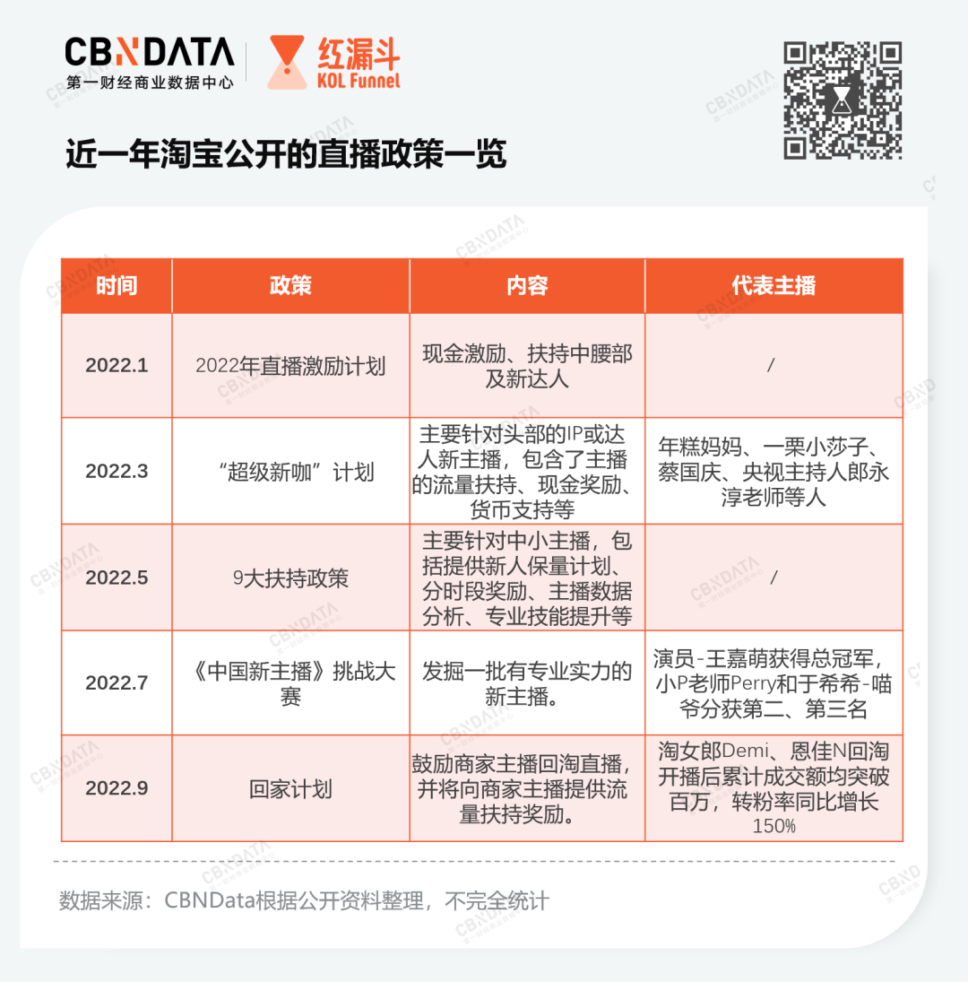 其實從去年開始,淘寶直播就開始重視細分賽道的人才培養(yǎng),2021年8月,淘寶直播推出領(lǐng)航計劃,鼓勵新達人主播入駐,此后一年多,淘寶陸續(xù)推出各種計劃進行激勵。為了更清晰地看到淘寶直播戰(zhàn)略的調(diào)整和偏向,CBNData梳理了近一年以來淘寶公布的重要直播舉措和政策內(nèi)容,詳情如下: