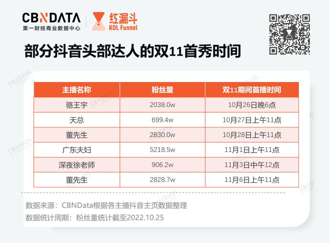 在抖音生態(tài)內(nèi),主播們的雙11首秀則有著明顯的時間“延遲”。CBNData發(fā)現(xiàn),頭部主播基本跟隨自身的時間安排、直播節(jié)奏,并未刻意為雙11做出改變。例如,“瘋狂小楊哥”日常為每周二周六直播,24號(周一)當天未做出調(diào)整;駱王宇、董先生、廣東夫婦等多位頭部主播將雙11首播放在26日及以后。在雙11大促期的中間時段,其他直播間的熱度已漸趨平穩(wěn),此時錯峰開播,或許會有不一樣的表現(xiàn)。