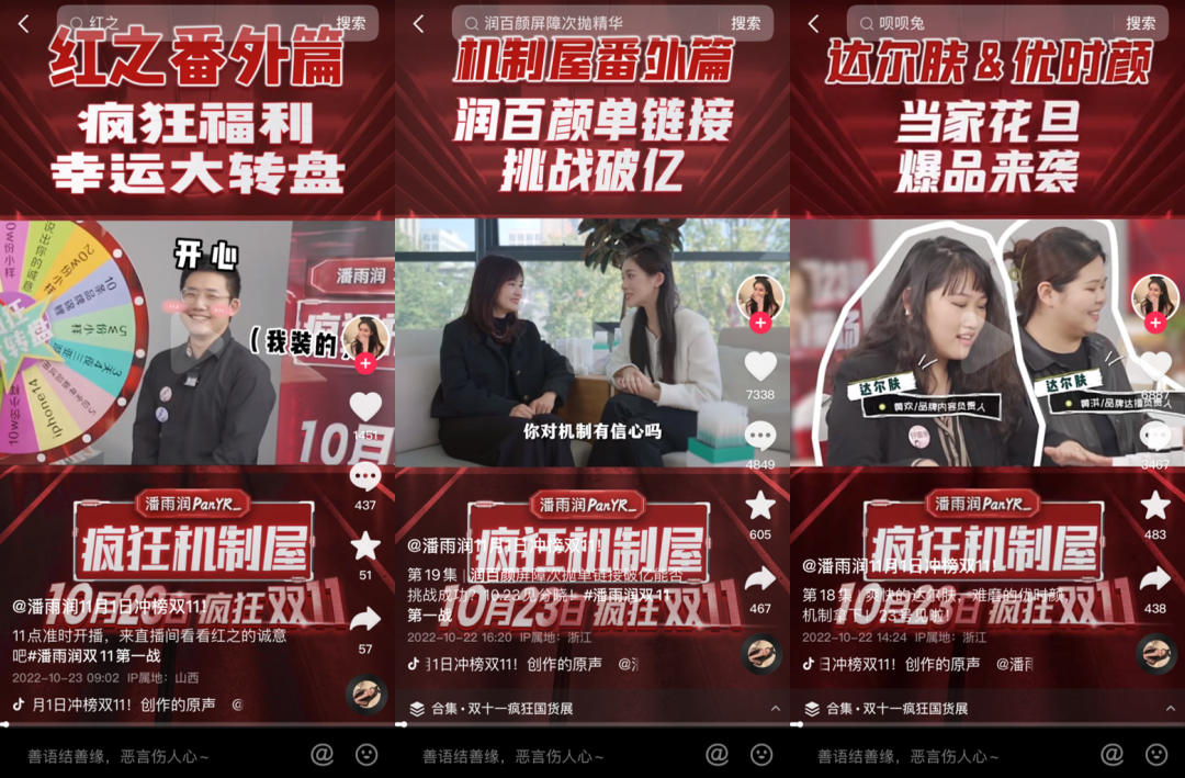 此外,美妝達人潘雨潤是少數(shù)為雙11大規(guī)模預(yù)熱的主播之一。雙11前夕,潘雨潤在線下設(shè)立“雙十一瘋狂國貨展”,并以瘋狂選品會、瘋狂機制屋等視頻內(nèi)容展現(xiàn)其選品、爭取優(yōu)惠的過程,與《所有女生的offer》系列有著共通之處。不過,評論區(qū)出現(xiàn)“模仿得太假”“好尷尬啊”等負面熱評,昭示著此類內(nèi)容并未完全博得用戶認可。達人從拼價格優(yōu)惠到拼內(nèi)容與創(chuàng)意,本會為直播帶貨行業(yè)帶來更多新鮮玩法,但在內(nèi)容與形式上進行創(chuàng)新、適合達人自身調(diào)性仍是重中之重。