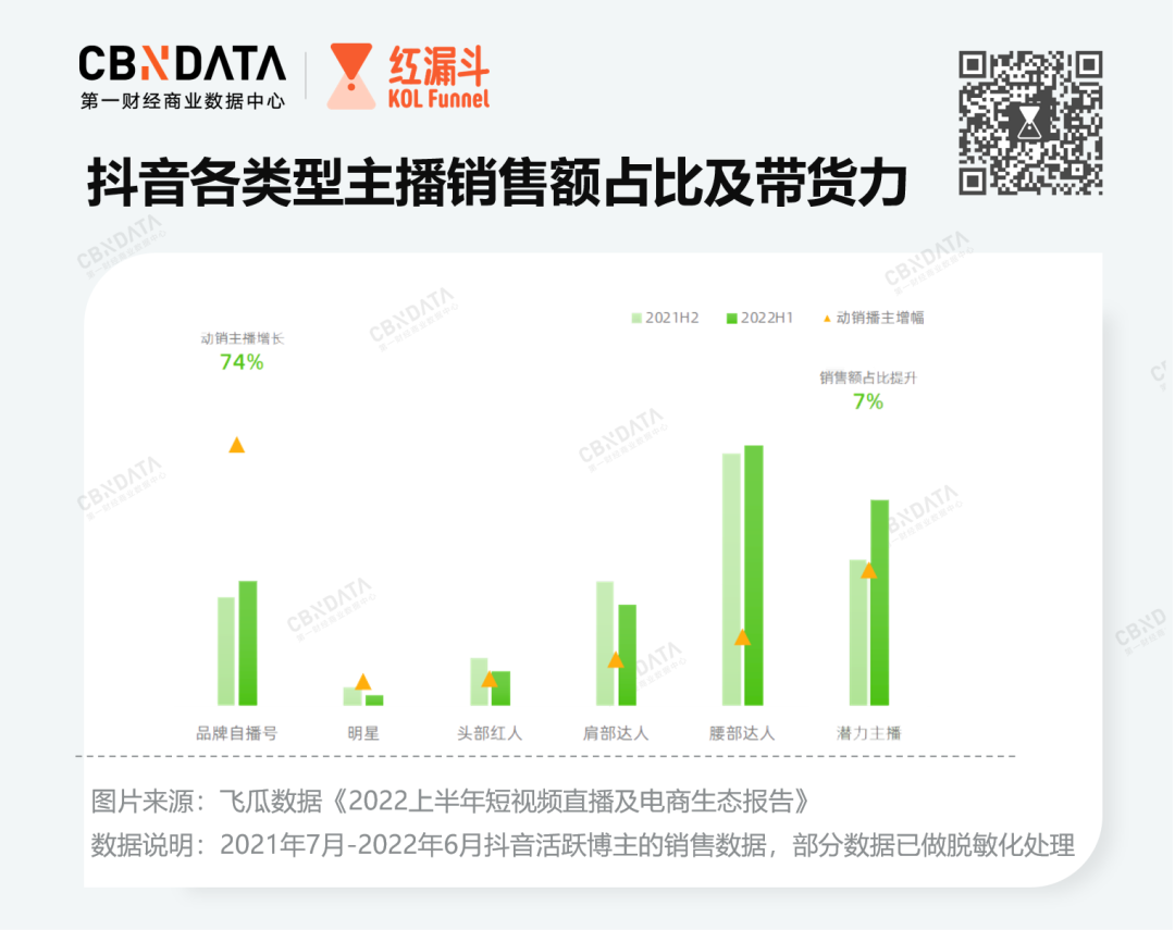 但跳出特定節(jié)點,從更長遠的階段看,品牌終究需要把流量收攏到自己手中,形成品牌自身的粉絲池。根據(jù)飛瓜數(shù)據(jù)《2022上半年短視頻直播及電商生態(tài)報告》顯示,2022年6月抖音品牌自播號數(shù)相比1月份增長近1倍。環(huán)比2021年下半年,2022年上半年明星、頭部紅人、肩部紅人的銷售額占比均有所下降,品牌自播號成銷售額增量重要來源?;ㄎ髯拥纫蕾囶^部主播成長起來的品牌,紛紛發(fā)力多平臺店鋪自播,嘗試將流量圈在自己的地盤。