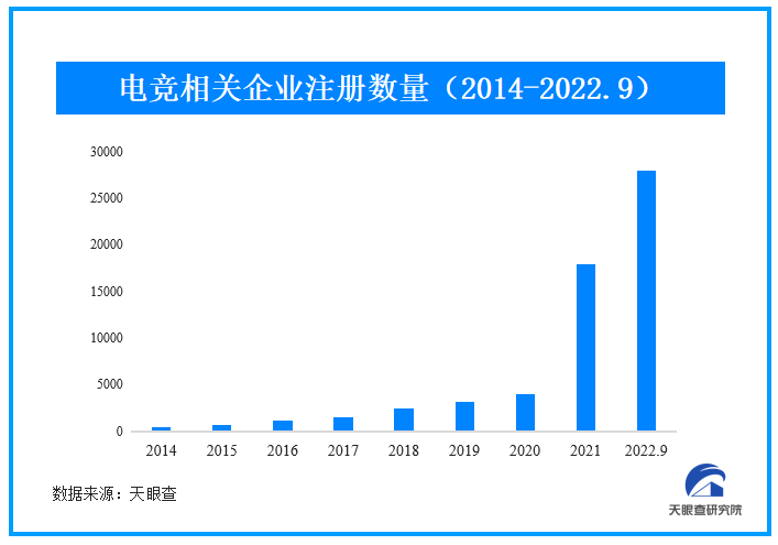 中國電競發(fā)展一路高歌猛進(jìn)。從2016年的1100余家到2022年的2.8萬家(注釋:此數(shù)據(jù)統(tǒng)計范圍為2022年1月1日—9月30日),近7年時間內(nèi)電競相關(guān)企業(yè)體量瘋漲超25倍。