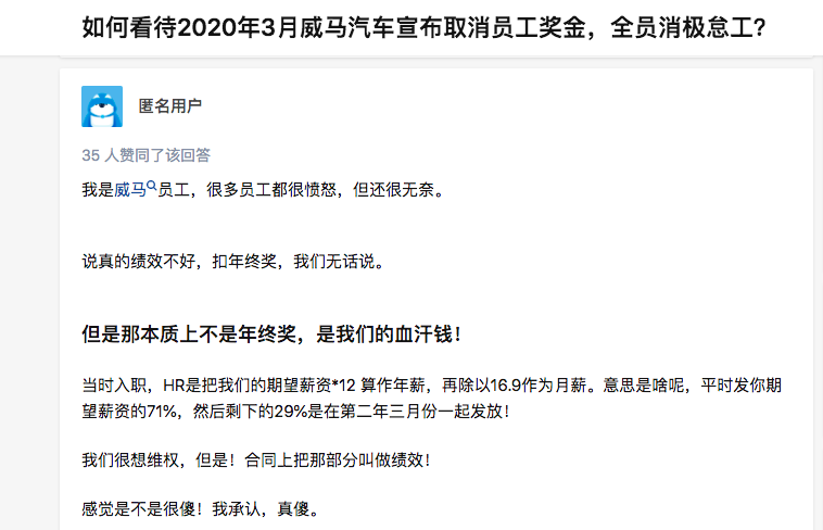 實際上,此次降薪并非首次。早在兩年前,就有威馬汽車員工在知乎等社交平臺上透露,威馬汽車以“賣車不多”為由,扣發(fā)了許多員工25%的年終獎。此外,為了逃避員工仲裁,威馬汽車特別將這部分年終獎稱作“績效”,也就是發(fā)放數(shù)額與公司效益及員工表現(xiàn)密切相關,即使公司借故不發(fā),員工也難以維權。