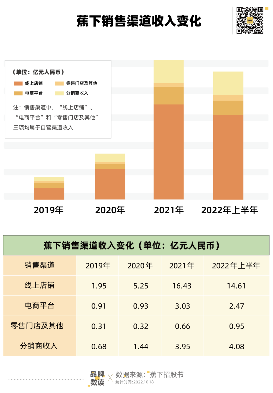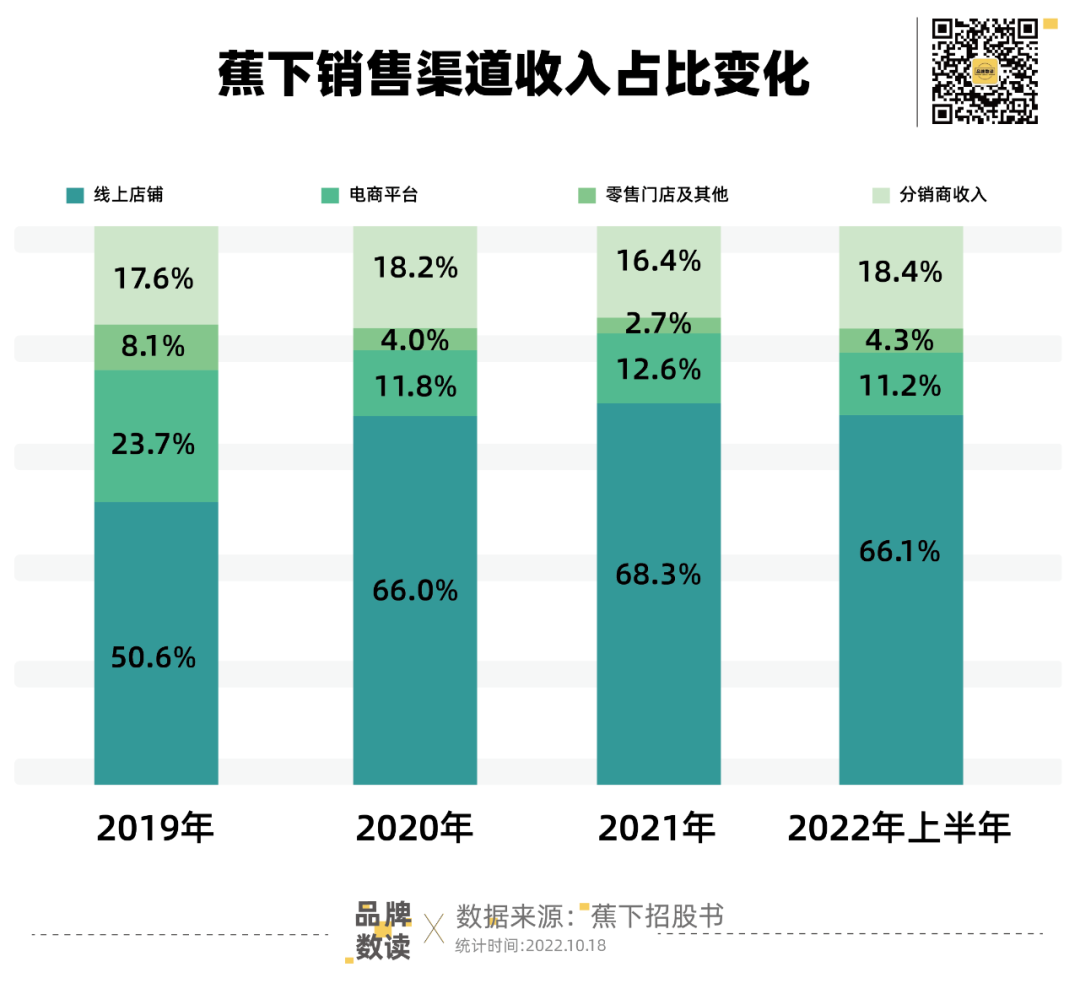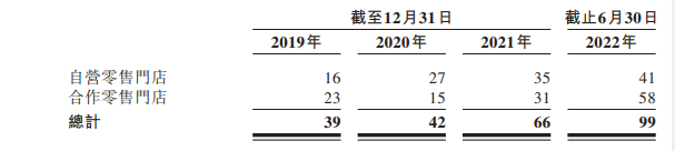 經(jīng)歷了2019年下半年至2020年下半年的劇烈開(kāi)關(guān)店后,蕉下逐漸恢復(fù)了開(kāi)店節(jié)奏,2021年新開(kāi)24家門(mén)店(8家直營(yíng)店和16家加盟店),2022年上半年新開(kāi)33家門(mén)店(6家直營(yíng)店和27家加盟店)。截至2022年上半年,蕉下共有99家門(mén)店中,有41家自營(yíng)零售門(mén)店和58家合作零售門(mén)店。