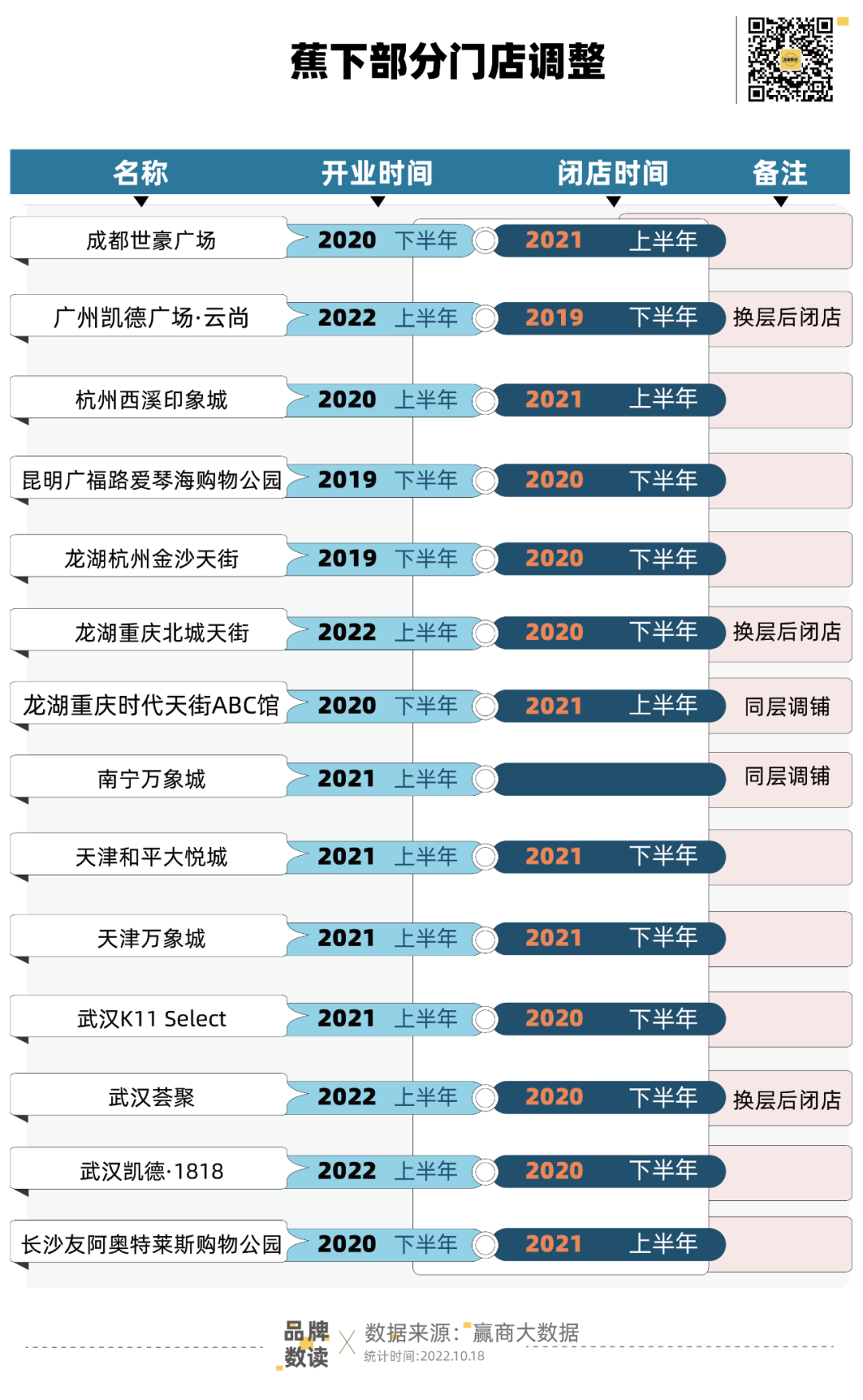 更多的門(mén)店,在開(kāi)業(yè)一年左右的時(shí)間直接關(guān)店,包括成都世豪廣場(chǎng)(2020下半年~2021年上半年)、杭州西溪印象城(2020年上半年~2021年上半年)、昆明廣福路愛(ài)琴海公園(2019年下半年~2020年上半年)、龍湖杭州金沙天街(2019年下半年~2020年下半年)、天津和平大悅城(2021年上半年~2021年下半年)、天津萬(wàn)象城(2021年上半年~2021年下半年)、長(zhǎng)沙友阿奧特萊斯購(gòu)物公園(2020年下半年~2021年上半年)的蕉下門(mén)店。