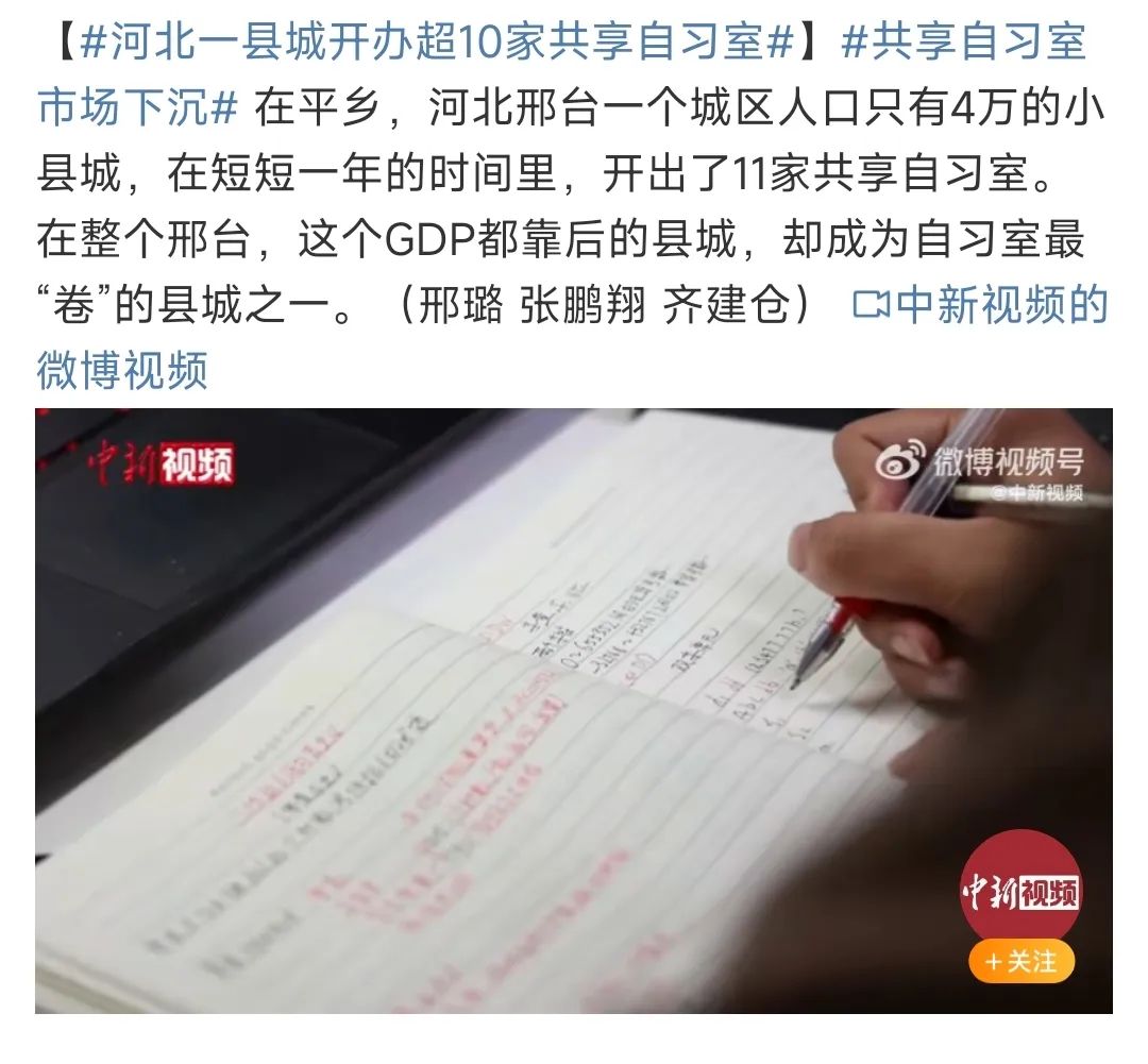 而近日,“河北一縣城開辦超10家共享自習(xí)室”的話題沖上微博熱搜,再次將這個原被認(rèn)為已經(jīng)退潮的行業(yè)拉回了公眾視野。
