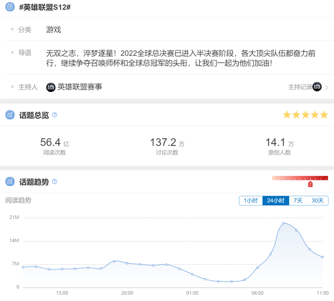 打開微博#英雄聯(lián)盟S12#和#ti11#的主話題頁面,你會發(fā)現(xiàn)這些話題頁的閱讀量和討論量均有一定的下滑。距離S12冠軍戰(zhàn)還有7天,但#英雄聯(lián)盟S12#話題頁的閱讀量為56.4億,討論次數(shù)為137.2萬,基本維持了去年一半的水平。目前決賽中已經(jīng)沒有了中國戰(zhàn)隊,不及去年的熱度已成定局。