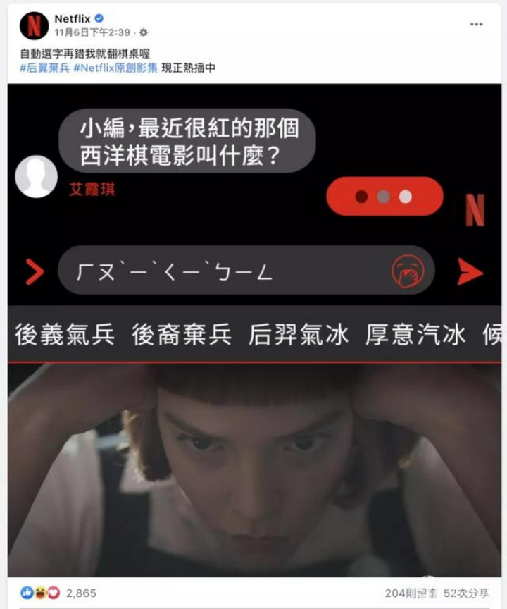 比如主創(chuàng)們的許多采訪,其實(shí)是在劇集播出一兩周后才陸續(xù)上線。Netflix也會(huì)根據(jù)劇集在各地區(qū)的不同表現(xiàn),以更本土化的方式在數(shù)據(jù)良好的區(qū)域做營(yíng)銷?!逗笠?xiàng)壉凡コ鰰r(shí),Neflix官方號(hào)就曾圍繞這個(gè)劇名很容易在中文鍵盤上打錯(cuò)的點(diǎn),把它變成一個(gè)梗來傳播。