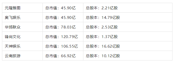 元隆雅圖總市值:45.90億總股本:2.21億股奧飛娛樂總市值:45.90億總股本:14.79億股華揚(yáng)聯(lián)眾總市值:78.03億總股本:2.53億股鋒尚文化總市值:120.79億總股本:1.37億股天神娛樂總市值:106.55億總股本:16.62億股云南旅游總市值:66.92億總股本:10.12億股