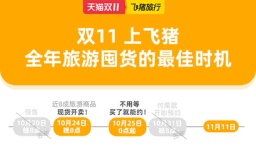 自10月24日20點飛豬“雙十一”啟動,全平臺超過80%旅游商品都以現(xiàn)貨方式銷售,并且從25日0點起,消費者就可以線上預(yù)約使用。