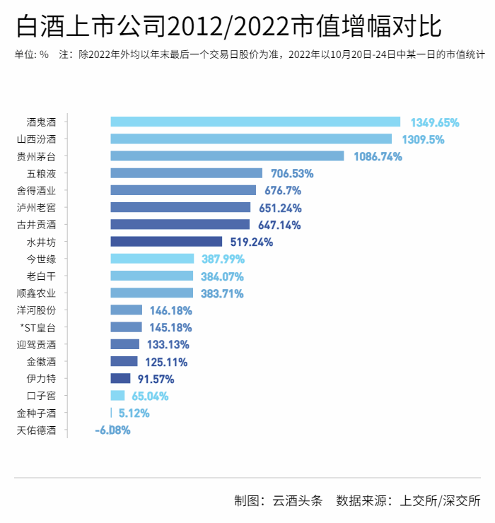 2012年至2021年的十年時間里,A股總市值從23.04萬億增長到91.61萬億,增幅為297.61%,市場規(guī)模居全球第二位,而19家白酒上市企業(yè)十年市值增幅高達710.75%。