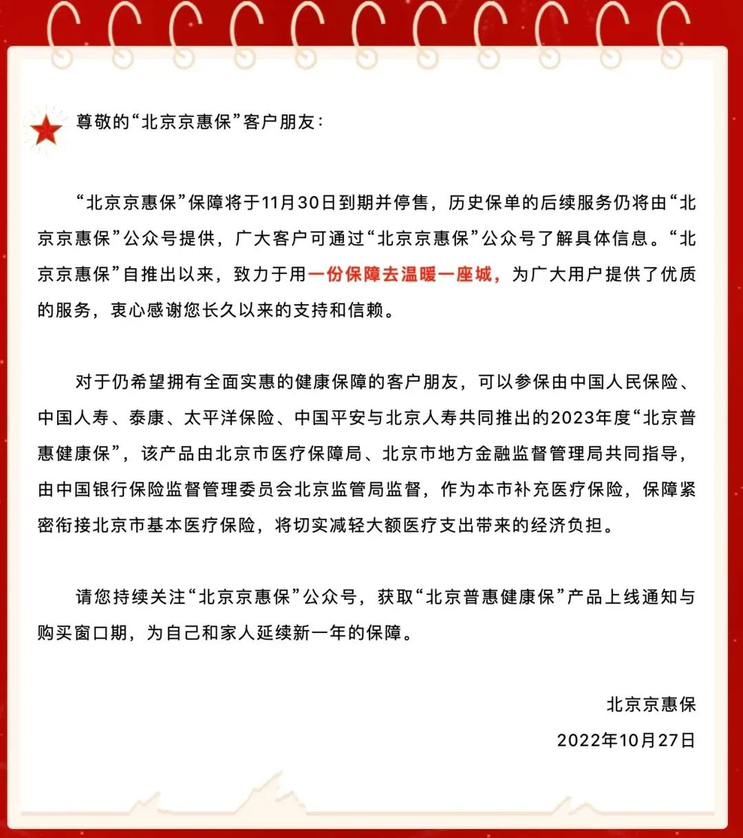 10月27日,“北京京惠?!惫娣Q,該產(chǎn)品將于11月30日到期并停售,歷史保單后續(xù)相關(guān)服務(wù)將由“北京京惠?!钡墓娞柼峁?。