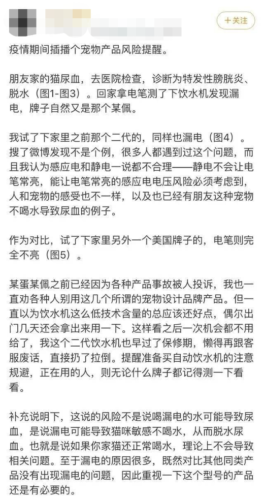 小佩智能寵物飲水機(jī)出問題的事件并非孤例。有網(wǎng)友反映,自家的小佩飲水機(jī)電源突然爆炸,插頭上的蓋子直接燒焦炸開,幸好當(dāng)時(shí)他和貓正在樓下睡覺,才沒造成更大傷害。還有網(wǎng)友表示,朋友家的貓尿血,去醫(yī)院檢查,診斷為特發(fā)性膀胱炎、脫水,回家用電筆檢測了后才發(fā)現(xiàn),買的智能飲水機(jī)漏電。