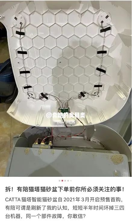 今年6月,有鏟屎官在小紅書上吐槽,有陪家的CATTA貓塔智能貓砂盆在短短半年內(nèi)壞掉三四臺(tái)機(jī)器,每次都是同一個(gè)部件出故障,可謂是刷新認(rèn)知。保修期過后,智能貓砂盆又壞了,該網(wǎng)友就自行拆開機(jī)器,看看是什么情況。