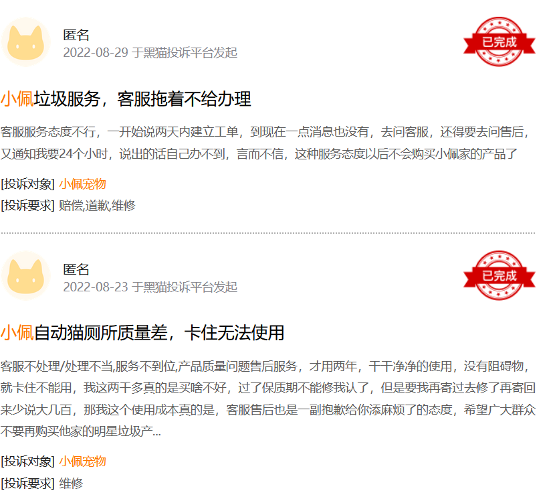 還有很多消費(fèi)者訴諸黑貓投訴平臺(tái),主要涉及質(zhì)量差、售后差等問題。不少人表示,在買有陪產(chǎn)品的一年內(nèi),不斷換新,不斷壞,產(chǎn)品缺陷始終不修復(fù),非常磨人。在Catlink、小佩寵物的投訴頁面,很多網(wǎng)友反映其售后服務(wù)不行,產(chǎn)品出現(xiàn)質(zhì)量問題后,客服拖時(shí)間,不愿維修處理。