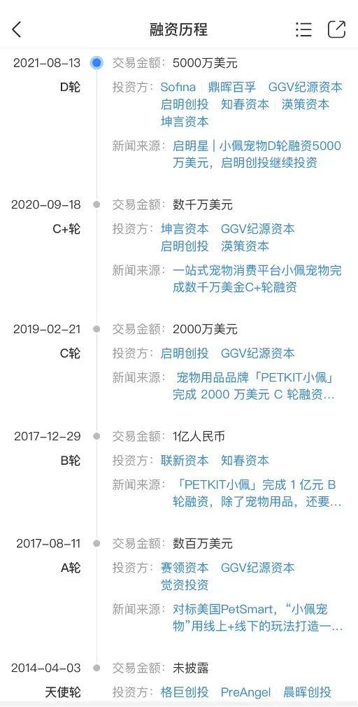 去年8月,小佩寵物宣布獲得D輪5000萬美元融資,由Sofina、鼎暉百孚領(lǐng)投,GGV紀(jì)源資本、啟明創(chuàng)投等投資方跟投。這是小佩寵物繼2014年以來的第六輪融資,在中國寵物行業(yè),它可以進(jìn)入2021年單筆融資規(guī)模的前五名。