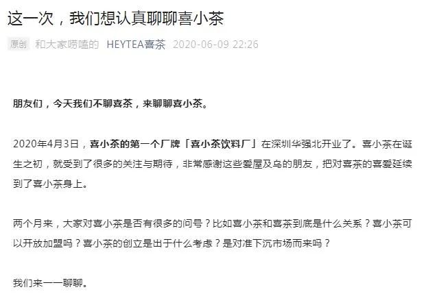 2020年6月9日,喜小茶正式開業(yè)兩個(gè)月后,喜茶公眾號(hào)發(fā)布《這一次,我們認(rèn)真聊聊喜小茶》,文中喜茶否認(rèn)了喜小茶對準(zhǔn)下沉市場的這一猜測,表示要回歸到“客戶第一”、“產(chǎn)品和品牌為核心”的價(jià)值觀,基于把用戶放在第一位去思考,而不是單純?nèi)栍脩粜枰裁吹睦砟?,才推出了喜小茶?!拔覀兿胪ㄟ^「喜小茶」帶給大家更合適的產(chǎn)品。”