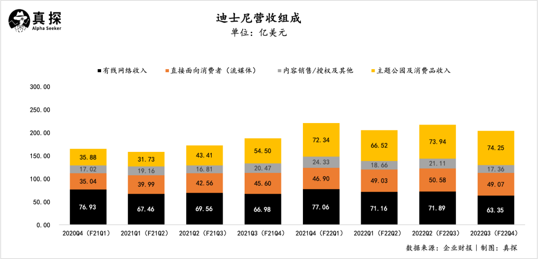 目前,迪士尼的主要營收組成包括四部分:有線網(wǎng)絡(luò)、直面消費(fèi)者(流媒體)、內(nèi)容銷售/授權(quán)(原影視娛樂)、主題公園及消費(fèi)品收入。
