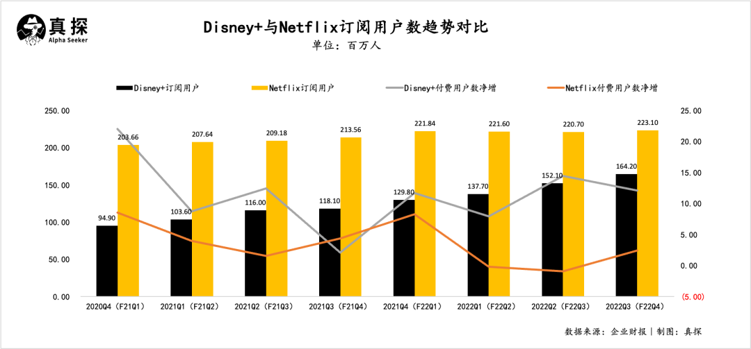 聚焦迪士尼的流媒體業(yè)務(wù)表現(xiàn),付費(fèi)訂閱用戶數(shù)繼續(xù)保持著增長態(tài)勢(shì),本季度ESPN+、Hulu、Disney+的付費(fèi)訂閱用戶數(shù)共增長了1460萬,其中Disney+貢獻(xiàn)了1210萬個(gè)訂閱量;2022財(cái)年至今共增加了近5700萬次訂閱,迪士尼流媒體平臺(tái)付費(fèi)訂閱用戶數(shù)達(dá)2.357億,超過了奈飛的2.23億。