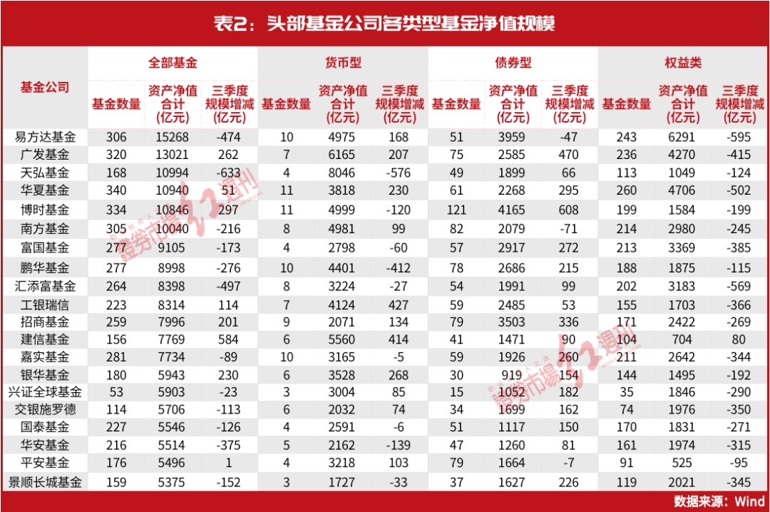當(dāng)上市公司三季報(bào)和基金三季報(bào)均落下帷幕,基金業(yè)的整體變化也正式定格。據(jù)了解,公募基金三季度的凈資產(chǎn)相比二季度有一定減少,但減少幅度不大。從權(quán)益類基金而言,頭部基金公司的權(quán)益類規(guī)模出現(xiàn)普遍下滑,惟一不同的是建信基金,該基金的權(quán)益類規(guī)模保持增長。